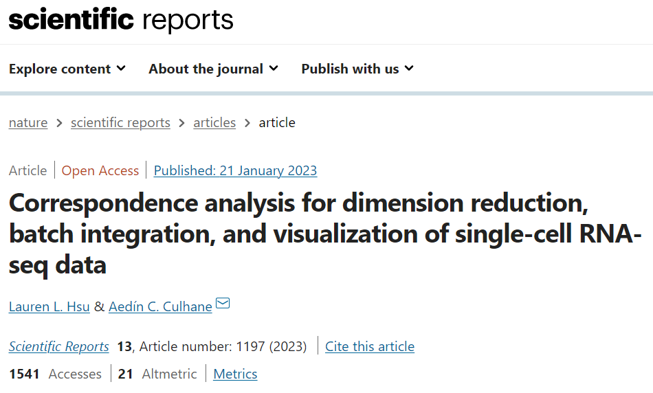 Nature子刊 | 将对应分析(CA)应用于scRNA-seq数据的降维、批量整合和可视化 近日《Scientific Reports》发表了一种基于计数的PCA替代方案:对应分析(correspondence analysis,CA),其基于卡方残差矩阵的分解,避免了失真的对数变换。