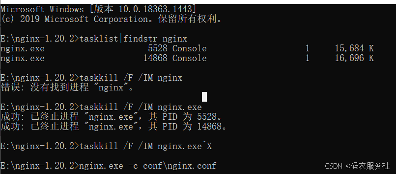 【Windows命令】Windows下启动Nginx后,在任务管理器里面没有发现nginx.exe进程 如题,当在本地Windows环境下想用反向代理时,突然发现在任务管理器里面没有发现nginx.exe进程,但是端口又是占用的。这时就要用Windows命令了。