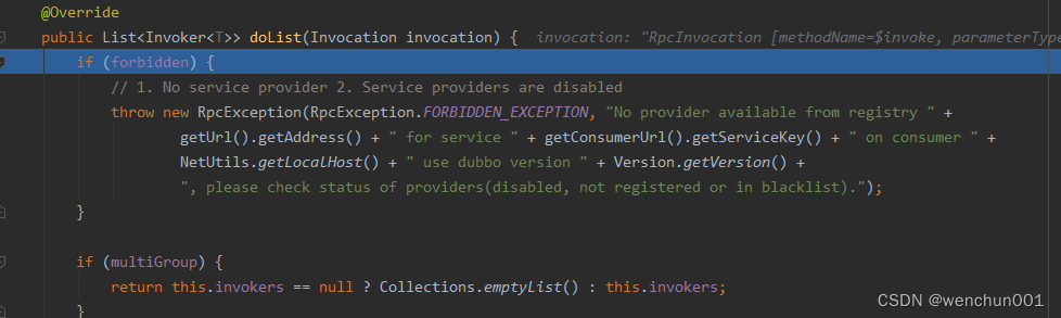 查看Nacos和ShenyuAdmin后台都有注册信息,那就很奇怪了。跟踪源代码,有几个地方,我们搜索“No provider available”后,打上断点进去看看啥情况: