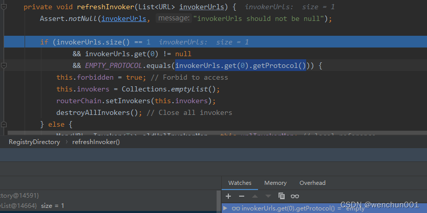 这时,在断点处往上看调用栈针,在org.apache.dubbo.registry.integration.RegistryDirectory