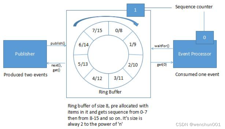 Sequencer (数据传输器) :Sequencer里面包含了Sequence,是Disruptor的核心,Seauencer有两个实现类: SingleProducerSequencer(单生产者实现)MultiProducerSeguencer(多生产者实现),Seguencer主要作用是实现生产者和消费者之间快速、正确传递数据的并发算法SequenceBarier(消费者屏): 用于控制RingBufer的Producer和Consumer之间的平衡关系,并且决定了Consumer是否还有可处理的事件的逻辑。WaitStrategy(消费者等待策略): 决定了消费者如何等待生产者将Event生产进Disruptor,WaitStrategy有多种实现策略Event: 从生产者到消费者过程中所处理的数据单元,Event由使用者自定义。