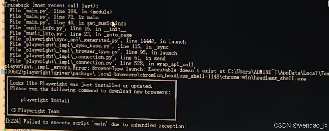 2.将C:\Users\Administrator\AppData\Local\ms-playwright下的chromium-1148文件夹和chromium_headless_shell-1148文件夹复制。3.打开holloProj\venv\Lib\site-packages\playwright\driver\package\.local-browsers文件夹,将之前复制的2个文件夹复制到这里。仔细阅读了错误提示发现还有东东没有打包进去。5.打包一次性成功!