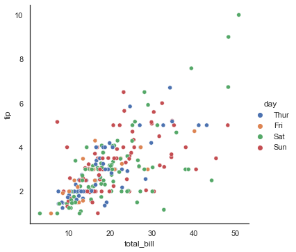 g = sns.relplot(x="total_bill", y="tip", hue="day", data=tips)