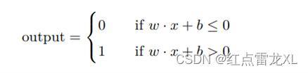 整个感知机的工作方式就像上式表达的那样,是一个分段函数,在输入x后由权重w和偏置b决定output。