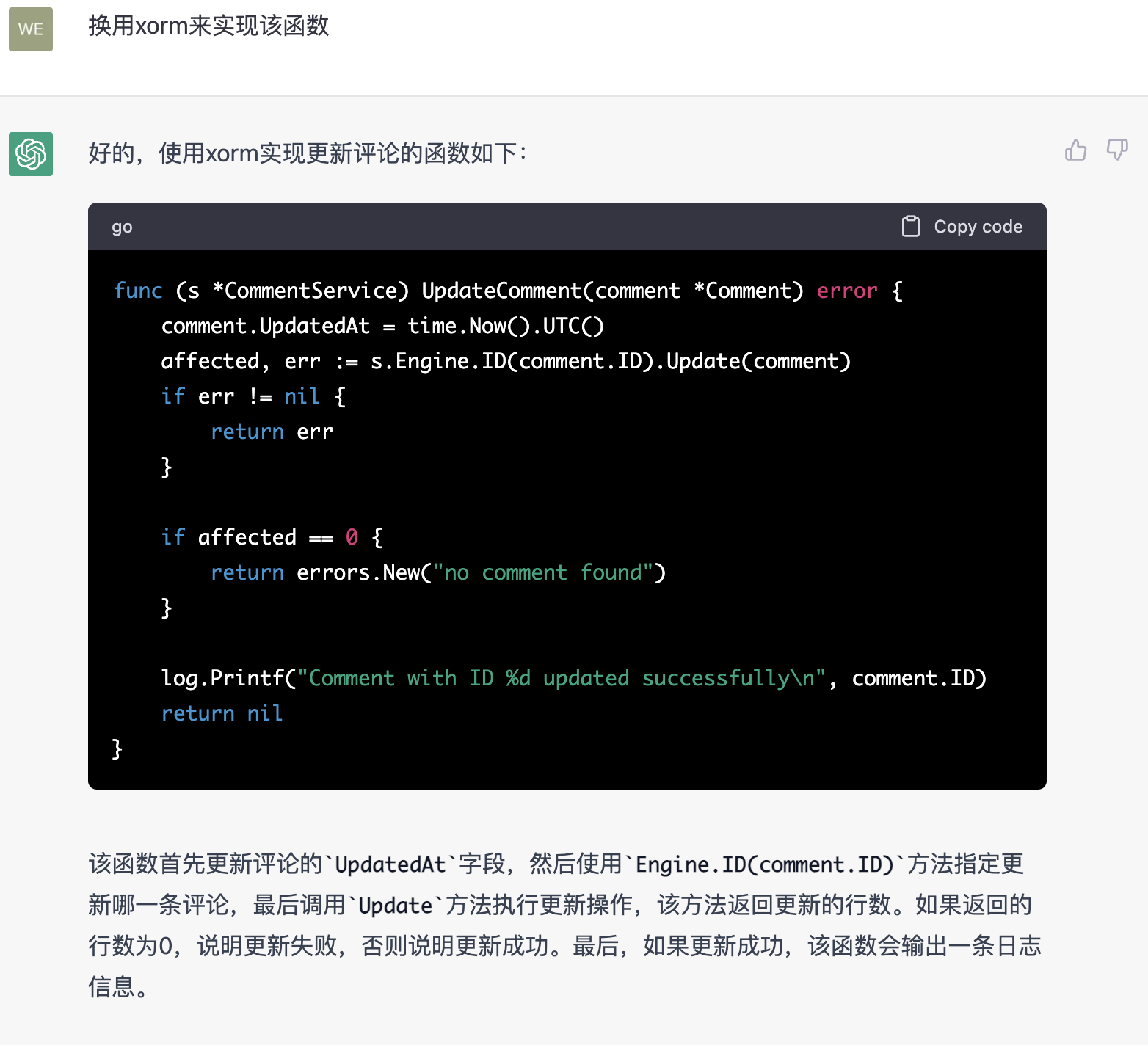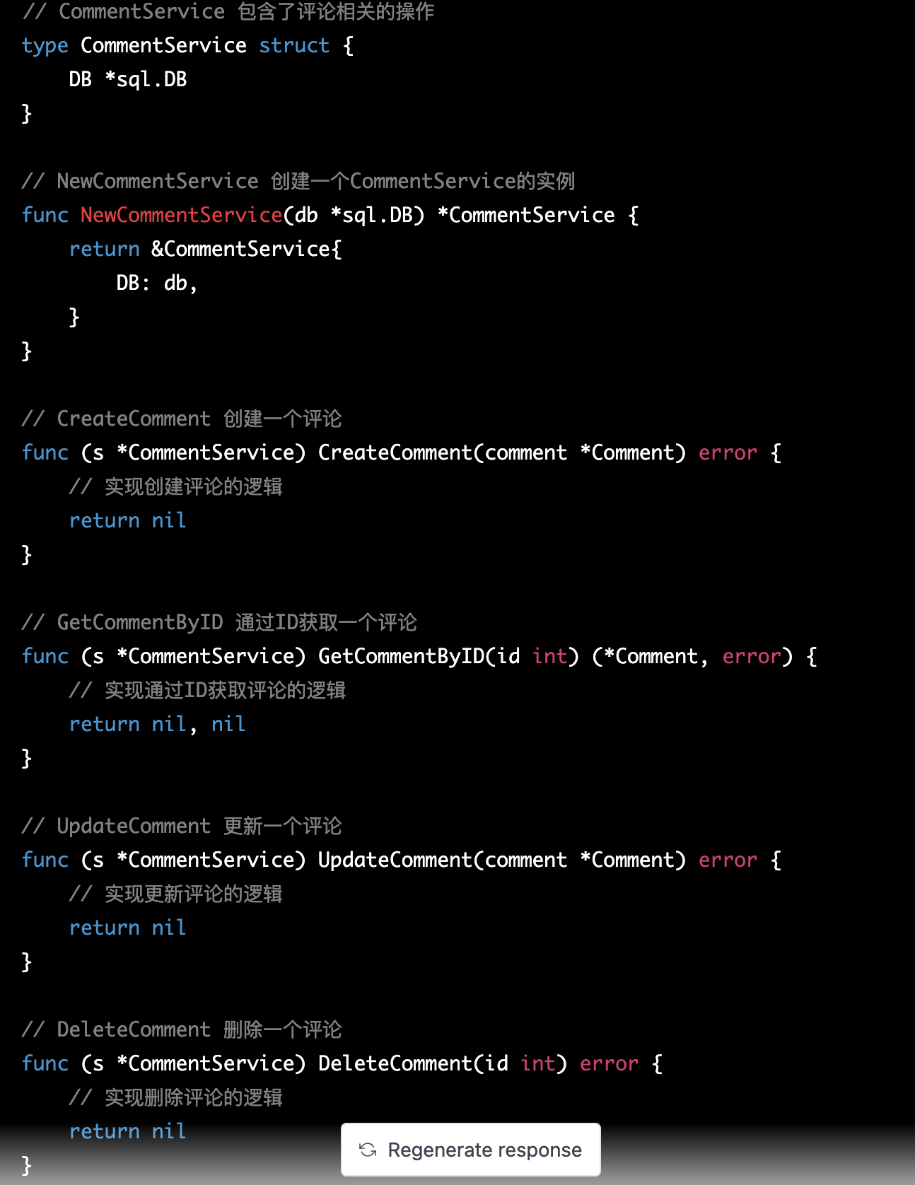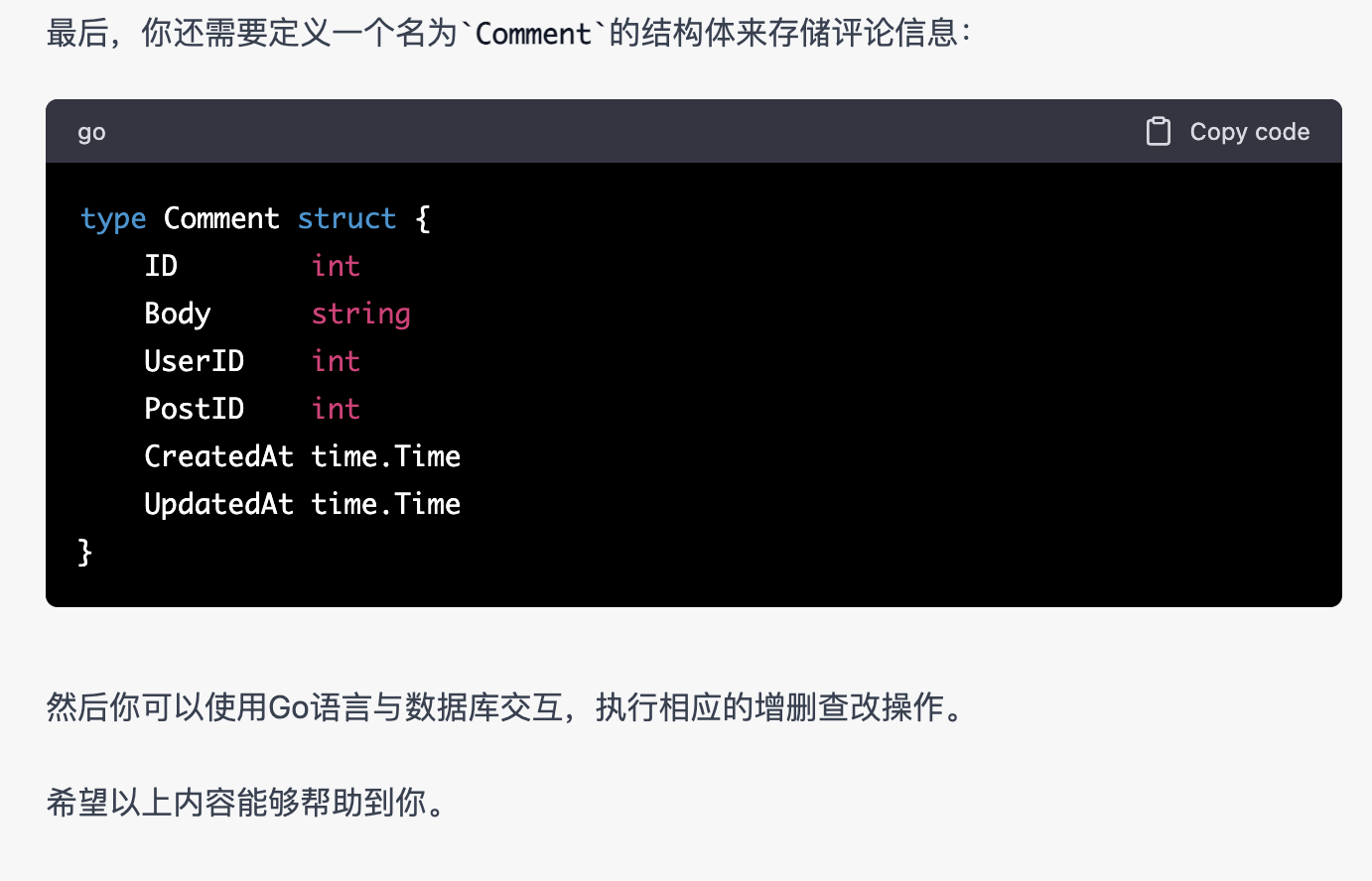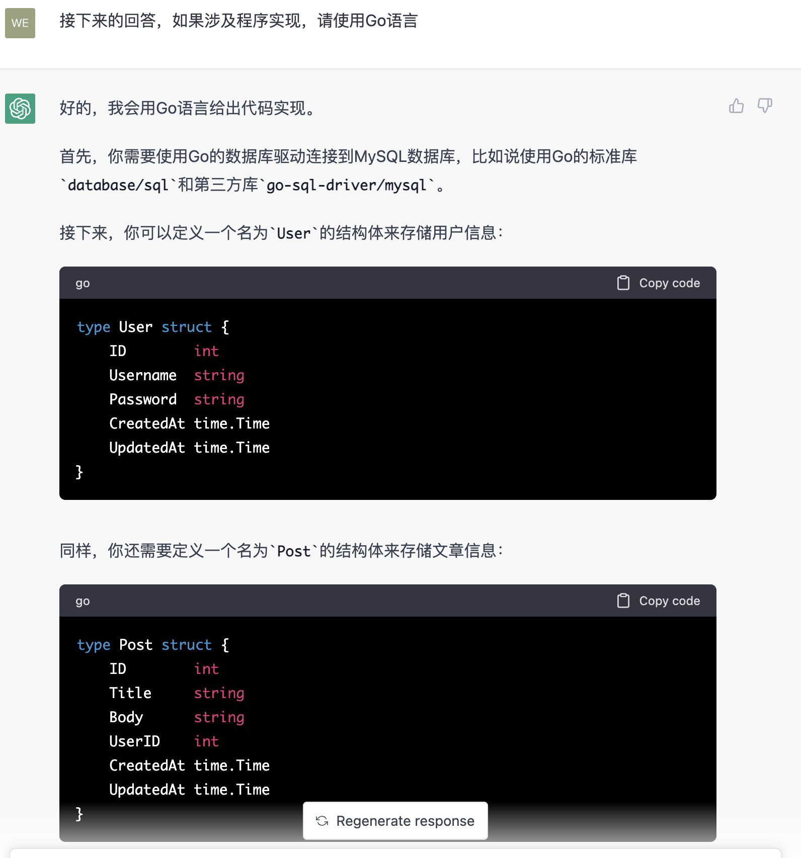 我们先设置接下来回答都基于Go语言实现,可以看到会自动给出对应的结构体设计