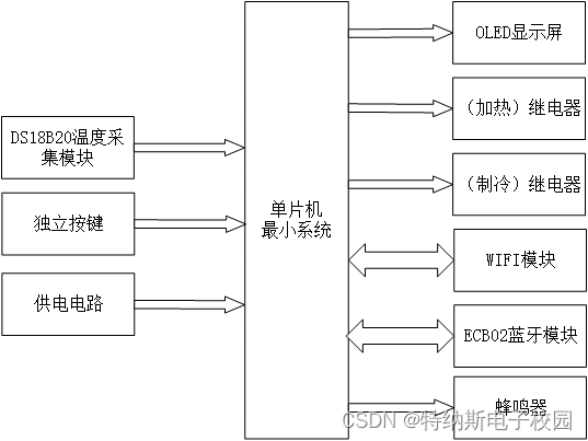本设计以STM32F103单片机为核心控制器,加上其他的模块一起组成的基于单片机的温度控制的整个系统,其中包含中控部分、输入部分和输出部分。中控部分采用了STM32F103单片机,其主要作用是获取输入部分数据,经过内部处理,控制输出部分。输入由三部分组成,第一部分是DS18B20温度采集模块,通过该模块可检测当前的温度值;第二部分是独立按键,通过独立按键切换界面、配网和调整温度阈值;第三部分是供电电路,给整个系统进行供电。输出由五部分组成,第一部分是OlED显示屏, 通过该模块可以显示当前温度、温度状态、温度阈值等;第二部分是加热继电器,当温度小于最小温度时,加热继电器闭合,进行加热;第三部分是制冷继电器,当温度大于最大温度时,制冷继电器闭合,进行制冷;第四部分是WIFI模块,通过WIFI连接手机来发送获取的温度值,方便实时监测、且可以设置温度阈值。第五部分是ECB02蓝牙模块,用蓝牙连接手机,可以实时获取温度值和温度状态、同时也可以通过蓝牙连接手机设置阈值。最后一部分是蜂鸣器,当温度不在阈值内时,进行报警。