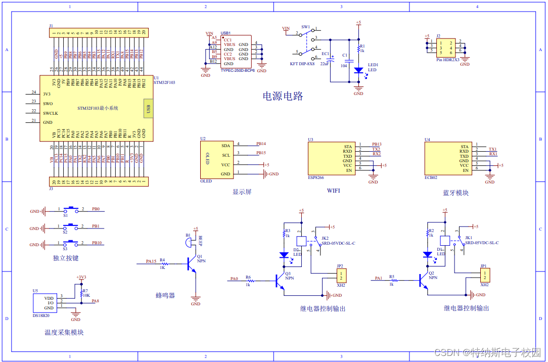 该设计采用STM32F103单片机作为核心,结合DS18B20温度传感器监测环境温湿度。用户可通过按键设定温度阈值,当温度超出范围时,蜂鸣器报警。系统还支持通过蓝牙和WIFI模块连接手机进行远程监控和阈值设置,OLED显示屏展示实时信息。