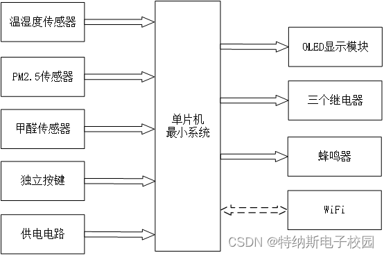 3.根据检测到的温度、湿度、PM2.5、甲醛控制继电器的开关;