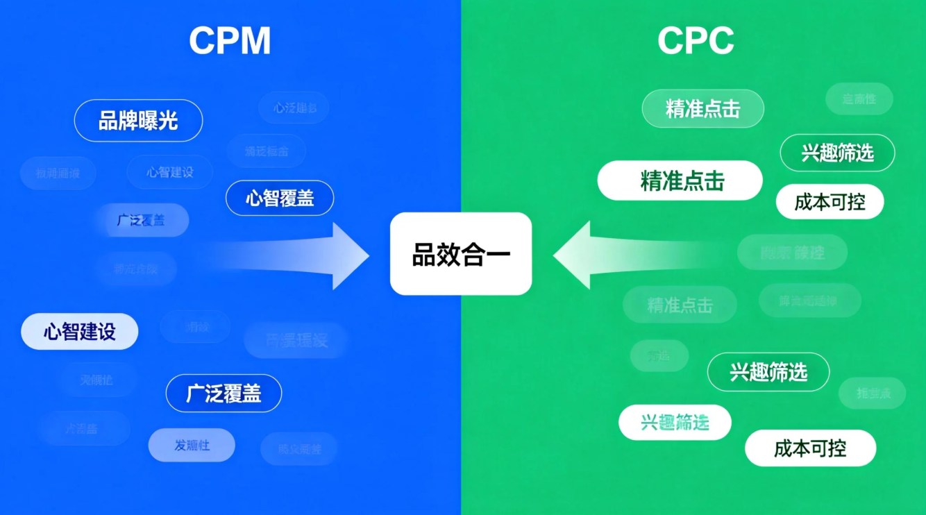 CPM/CPC的契合点:解耦了“沟通”与“转化”的即时压力。CPM模式允许品牌在用户兴趣培养期,通过高质量内容实现广泛而经济的曝光,播种信任;CPC模式则用于衡量用户对何种具体价值主张产生初步兴趣,为后续培育提供高质量入口。