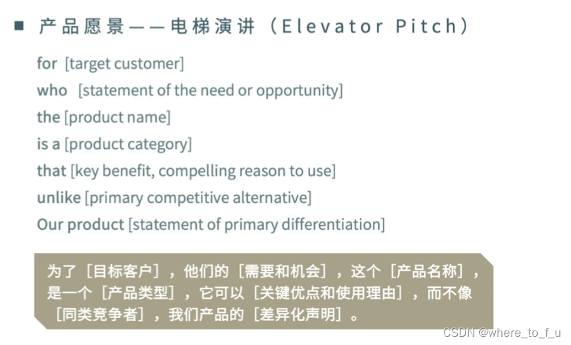 电梯演讲(Elevator Pitch)是一个非常好的描述产品愿景的工具或手段,它可以在很短时间内,将产品愿景清晰地表达出来,其格式如下。