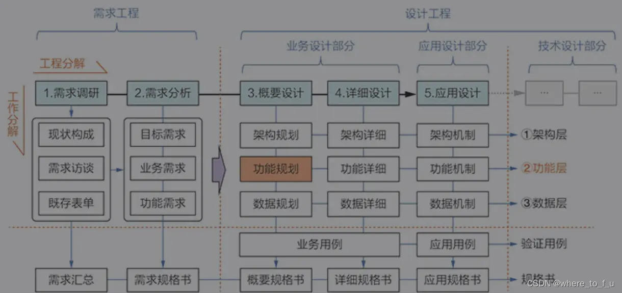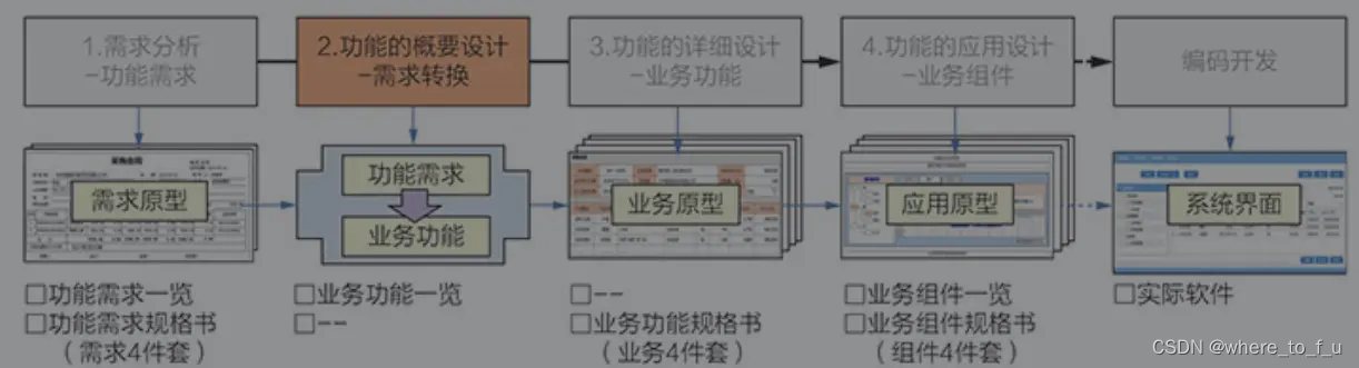 从软件工程上功能的全过程看,这是对需求工程收集到的需求按照功能设计标准进行的第一次设计,也是从需求工程进入到设计工程的转换点,它的作用是将需求阶段的成果用设计的标准进行梳理、分类、规划、汇总,为后面的详细设计奠定基础。功能的概要设计是粗线条的,重点是将尚未完全确定的“功能需求”确定为正式的“业务功能”。