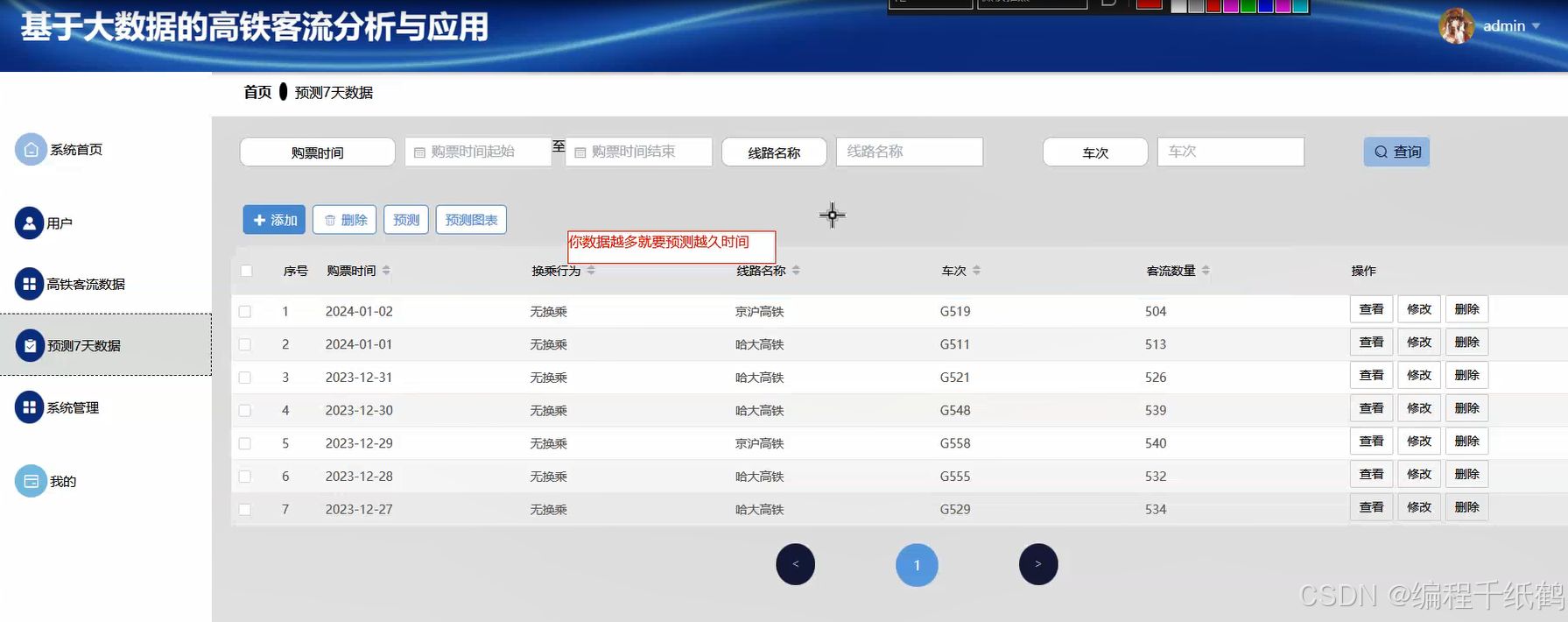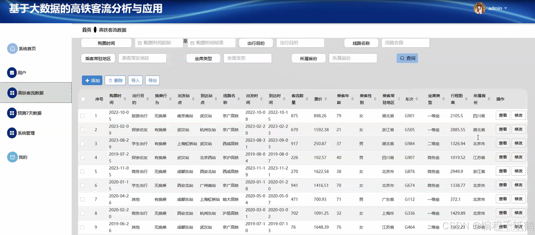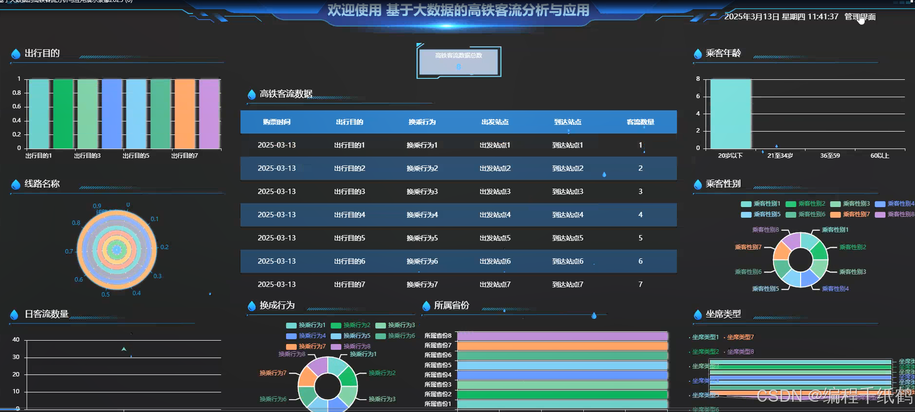 本课题主要研究如何使用大数据技术和数据分析技术,对高铁客流数据进行分析,根据需要了解信息,将数据以可视化大屏的方式来进行体现,以更加直观的视角来提供数据支撑。具体功能主要实现了通过Spark大数据技术实现高铁客户数据可视化分析、实现对高铁客流数据的基本管理、通过机器学习实现对客户数据的预测等核心功能,同时提供了用户注册登录,查看公告,在线留言等的相关辅助功能。在技术开发上主要采用大数据Spark技术,Django开发框架以及机器学习等相关技术进行开发实现.