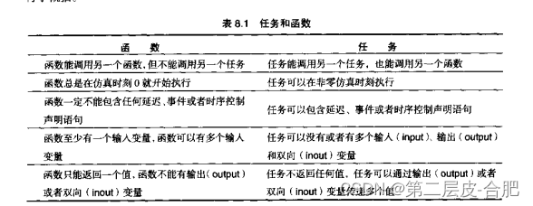 任务可以具有任意多个输人、输人/输出( inout)和输出变量。在任务中可以使用延迟、事件和时序控制结构,在任务中可以调用其他的任务和函数;
