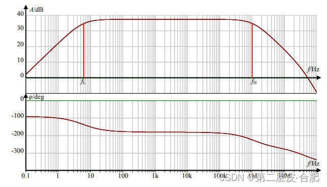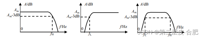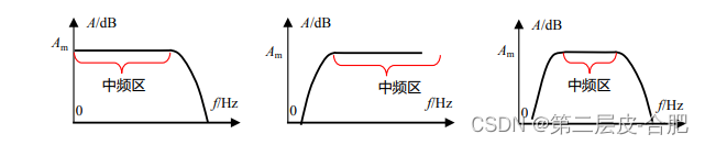 右图是带通环节的幅频特性,它的特点是,中间一个频率区域为中频,其增益是近似不变的,为中频增益Am。左侧,随着频率的下降,增益开始下降,直至增益变为0,具有下限截止频率f。右侧,随着频率的上升,增益也开始下降,直至增益变为0,具有上限截止频率f币。