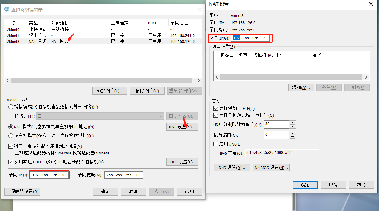 虚拟机无法ping通本机ip和www.baidu.com问题 我们在使用虚机的时候往往需要实现以下几种情况:本机 ping 虚机ip虚机 ping 本机ip虚机 ping baidu.com不知道大家有没有感触,每次装虚机的时候都会遇到网络设置的问题,网上看了些自己也总结下,其实最主要的就是两块设置:vm虚拟网络编辑器 和 虚机网络配置文件ifcfg-ensx,至于代理设置等这里不做介绍。NAT模式下实现首先是 编辑->虚拟网络编辑器,这里注意开头的三段192.168.126要保持一致,其中126可以自由设置,NAT网关IP最后一段一般设成 1/2