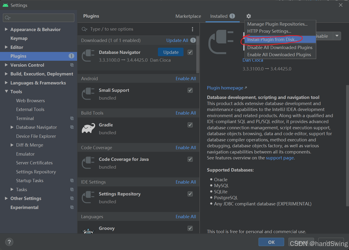在android studio设置setting中找到插件plugins,再点击installed后面的设置