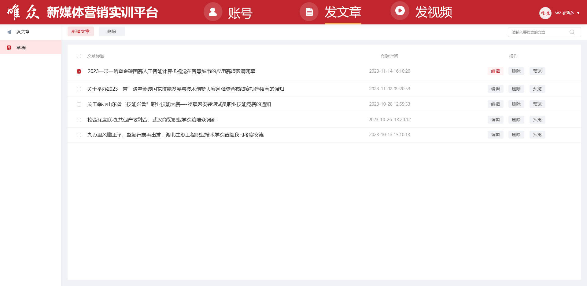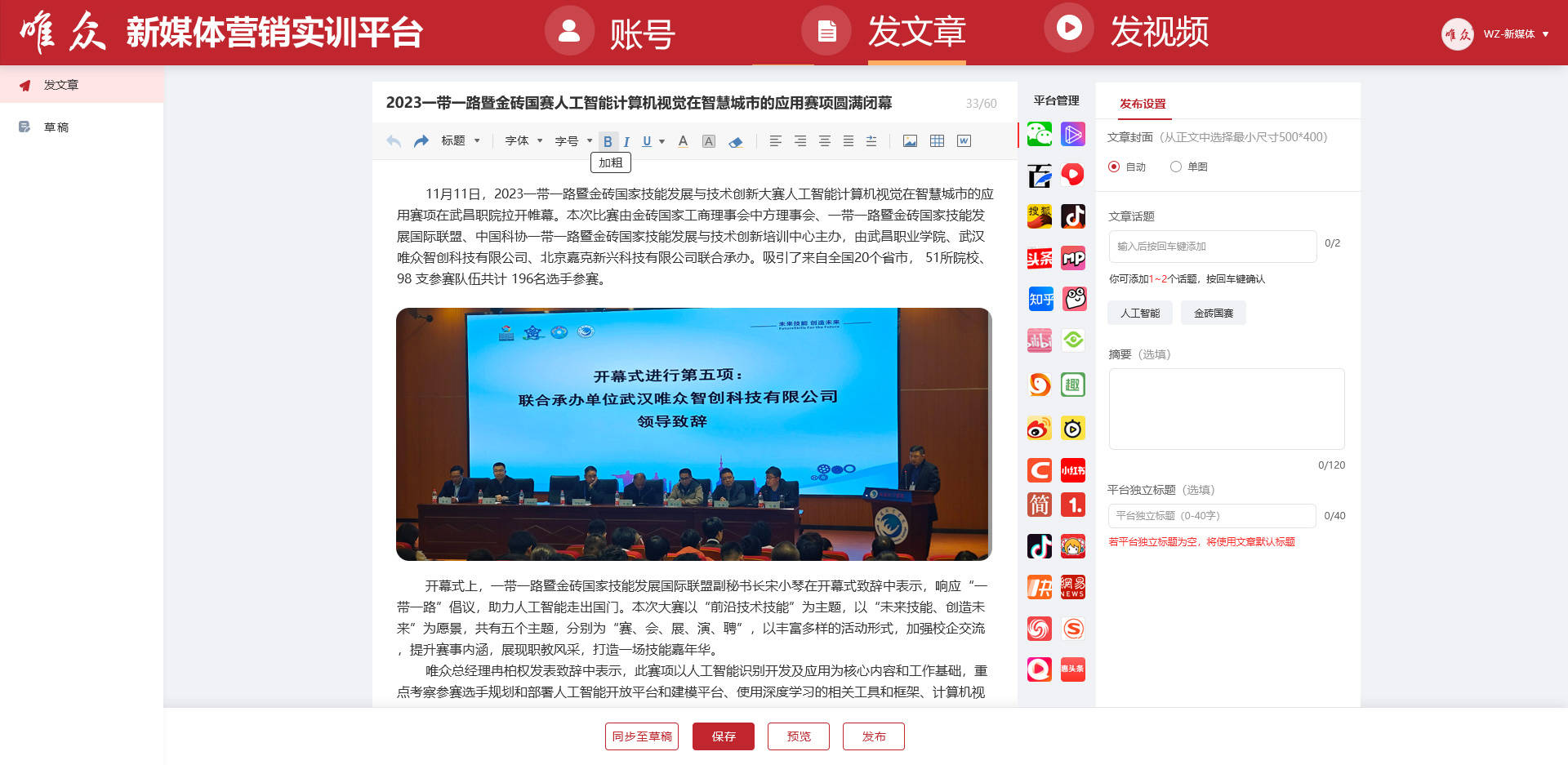 全套工具: 配备完善的账号管理、文章编辑器、平台设置、一键发文章和我的文章等功能,帮助学生全面掌握新媒体运营的方方面面。