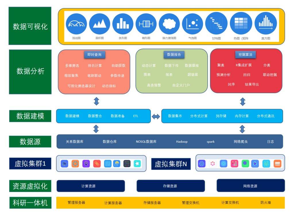 平台底层是支持科研所需的硬件资源,通过虚拟化系统将硬件资源虚拟化为统一的资源池,可根据每个课题、每位老师的需求弹性分配虚拟集群。图形化网络爬虫系统为科研项目提供数据,之后用户可通过图形化数据分析及可视化系统实现数据的处理、分析、挖掘和可视化。