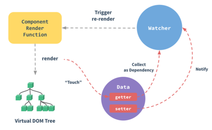当响应式数据发生变化的时候,也就是触发了 setter 时,setter 会负责通知(Notify)该数据的订阅者列表里的 Watcher,Watcher 会触发组件重渲染(Trigger re-render)来更新(update)视图。