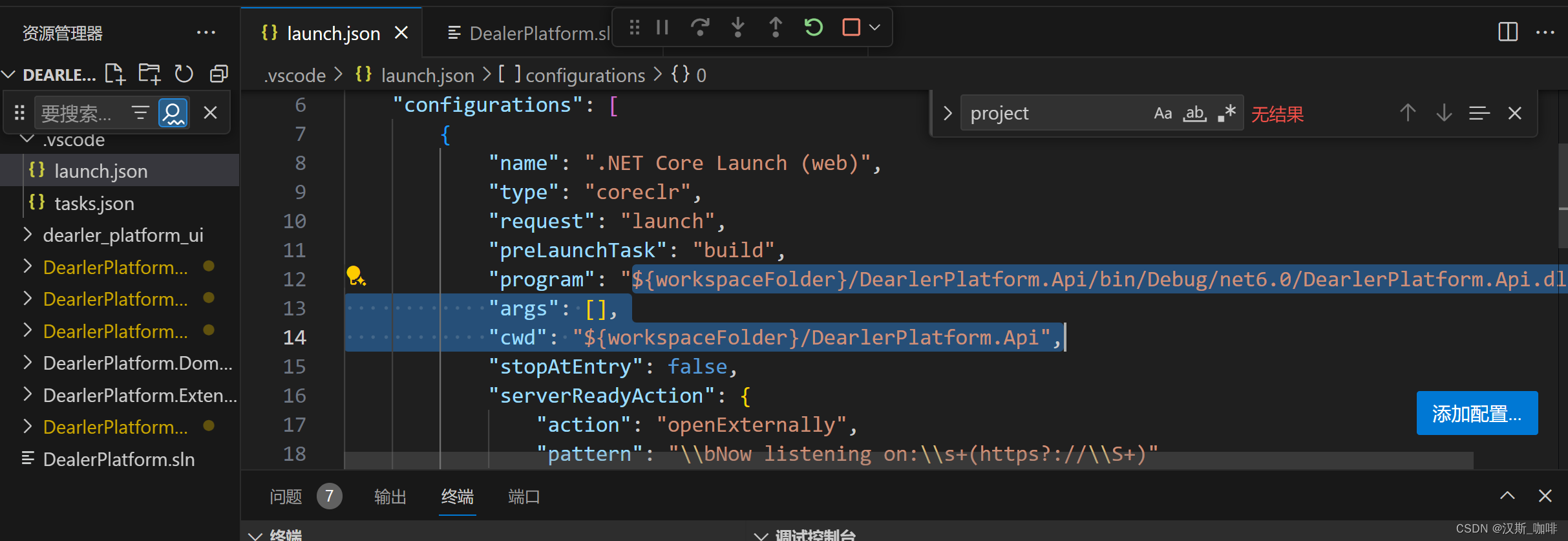 在vscode卸载.net项目并修改sln解决项目 首先要在lauch.json文件中修改,这个lauch和task的文件可以直接删除然后重新生成,主要是sln解决方案文件需要修改。注意:如果仅在vs2022设置卸载是不会影响vscode的加载项目。然后是sln文件删掉你需要卸载的项目。