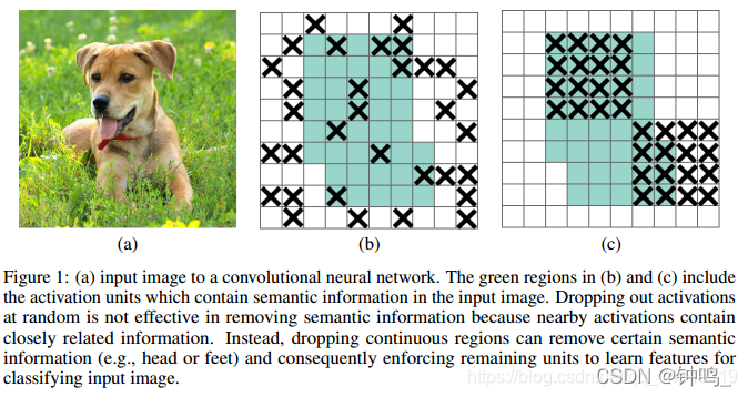 ©绿色部分表示激活的特征单元,c图表示本文的DropBlock,通过dropout掉一部分相邻的整片的区域(比如头和脚),网络就会去注重学习狗的别的部位的特征,来实现正确分类,从而表现出更好的泛化。