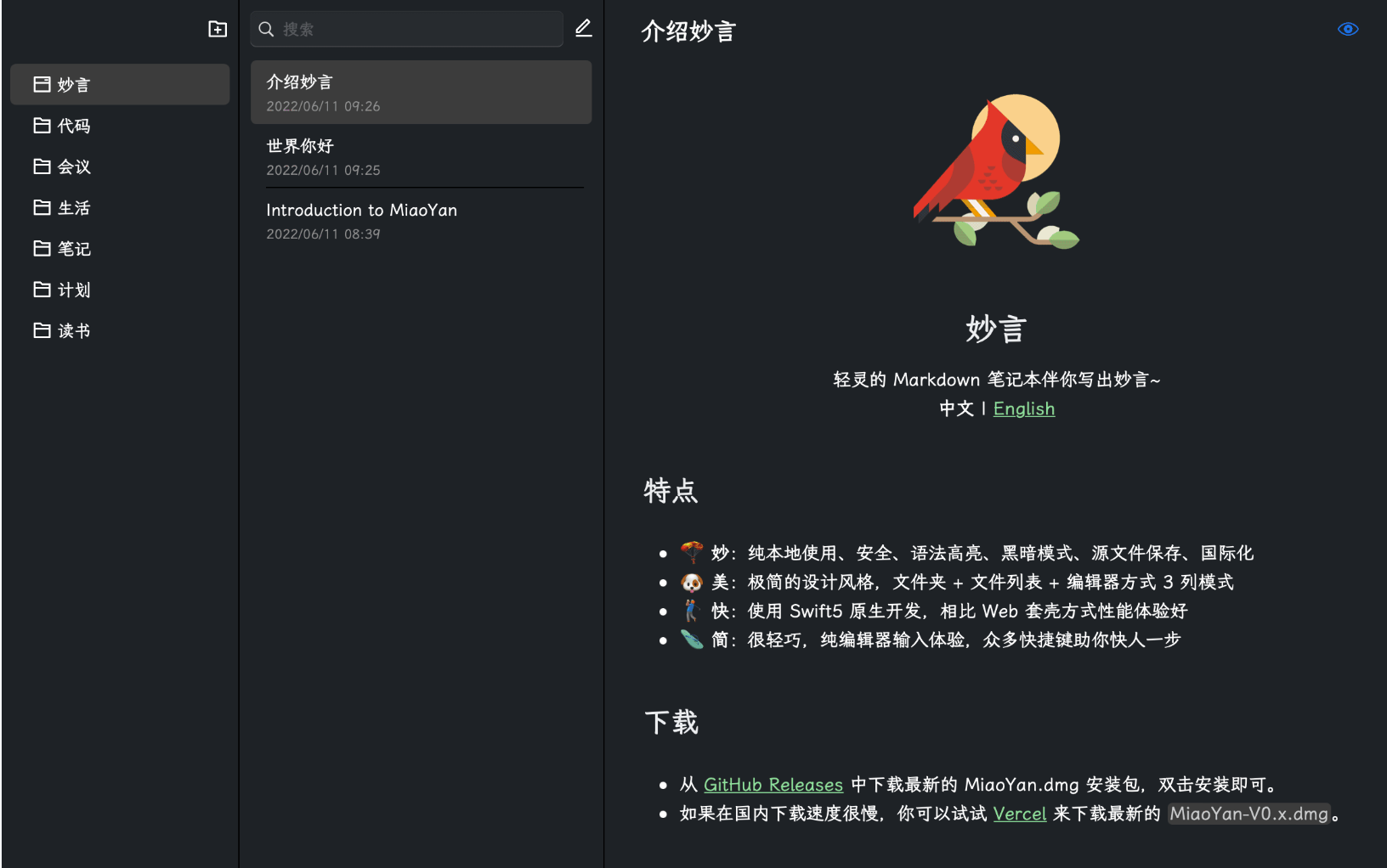 - 🪂 妙:纯本地使用、安全、语法高亮、黑暗模式、源文件保存、国际化、演示模式、文档自动排版;