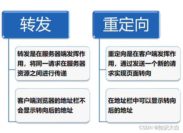 转发: 一次请求(URL不变) 是服务端内部的资源交互 转发过程中数据不会丢失