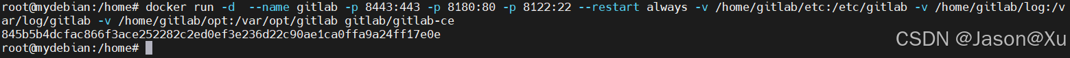 docker run -d --name gitlab -p 8443:443 -p 8180:80 -p 8122:22 --restart always -v /home/gitlab/etc:/etc/gitlab -v /home/gitlab/log:/var/log/gitlab -v /home/gitlab/opt:/var/opt/gitlab gitlab/gitlab-ce