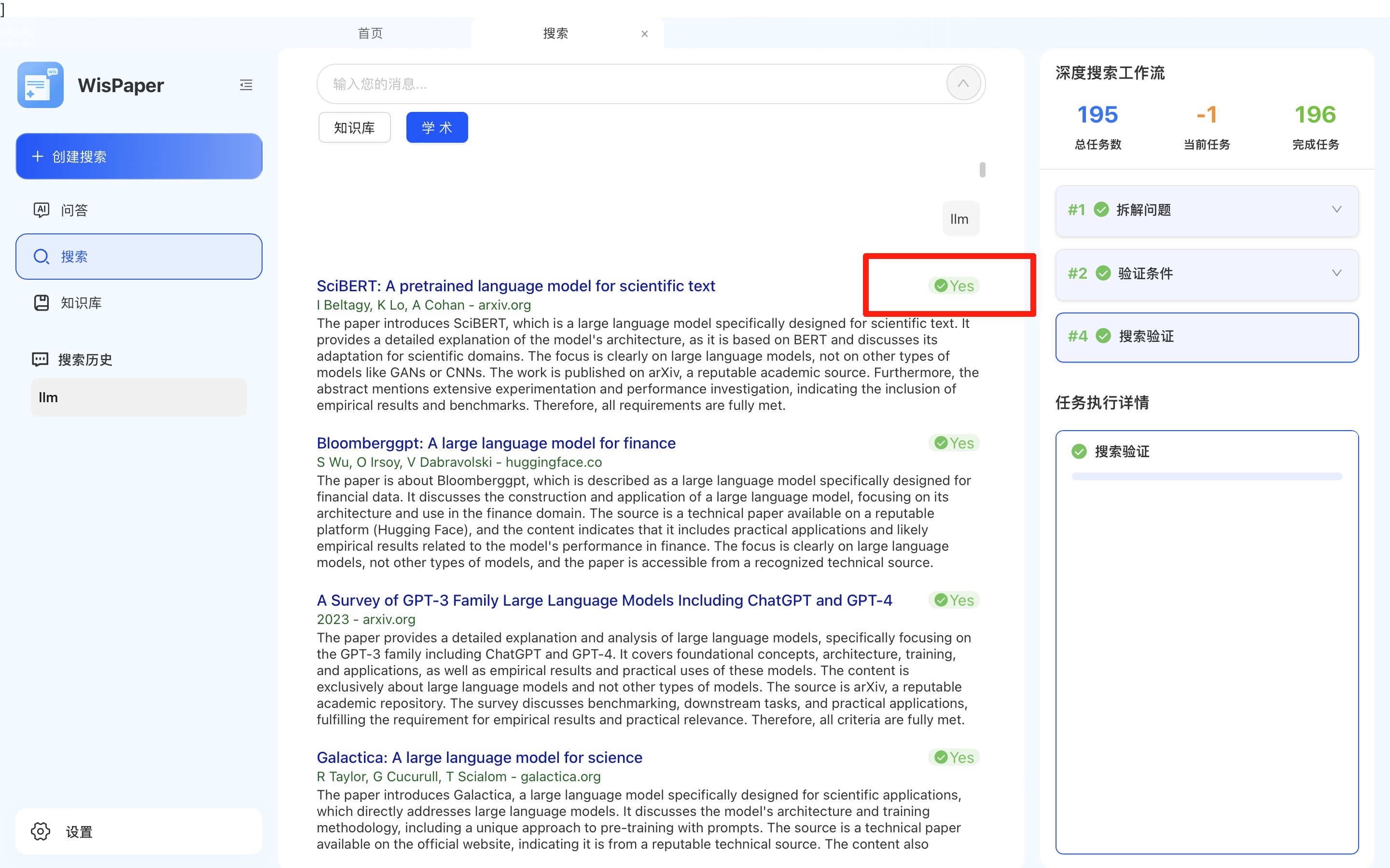 对接主流学术数据库如Google Scholar,精准查找全球范围内的相关前沿研究。比如当你搜索“LLM”这类专业术语时,传统搜索引擎或学术库给出海量结果,却不一定精准匹配你的需求。而 WisPaper 能智能拆解你的问题,通过二次验证和深度搜索,快速锁定最符合你要求的高质量文献