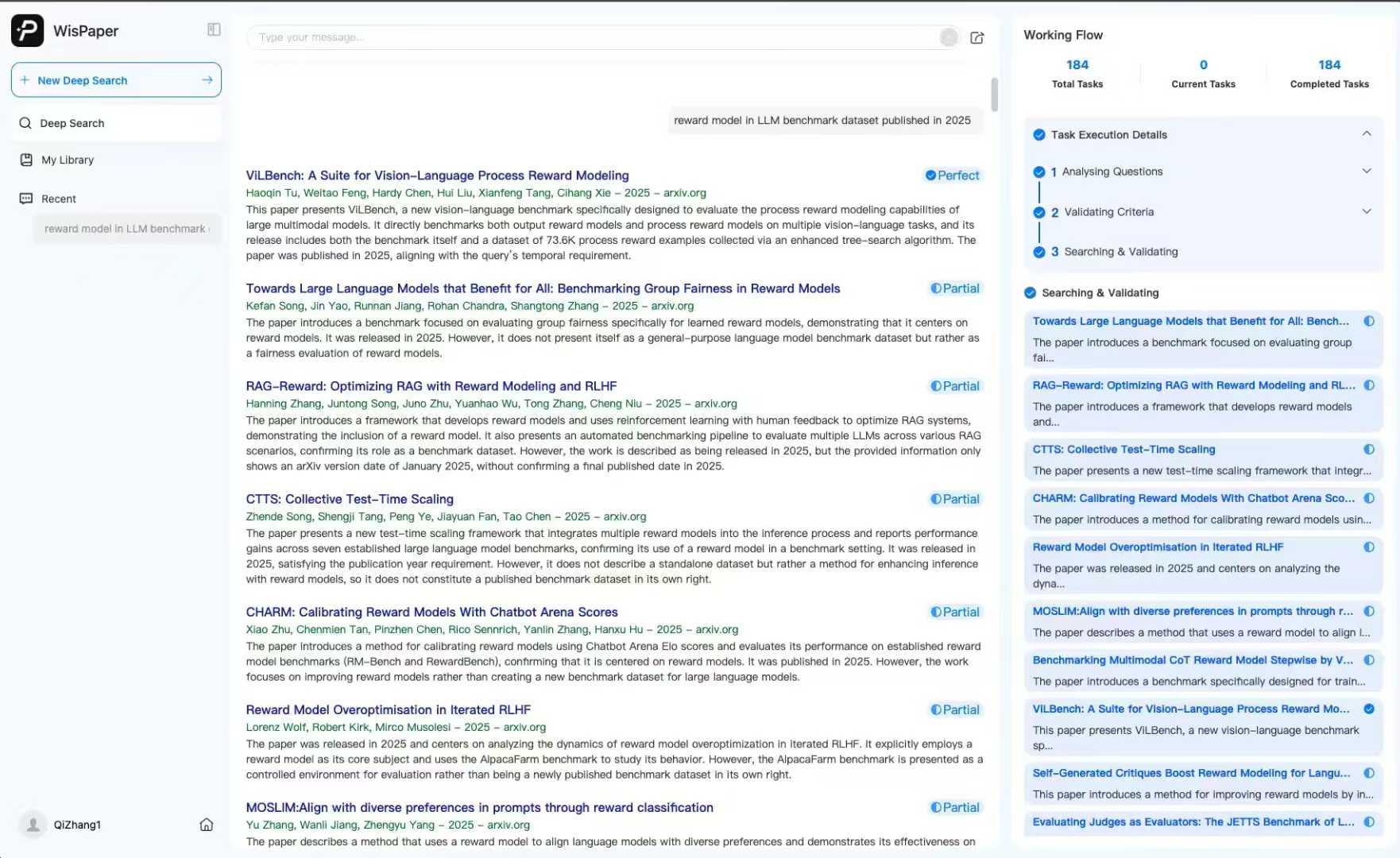 对接主流学术数据库如Google Scholar,精准查找全球范围内的相关前沿研究。比如当你搜索“LLM”这类专业术语时,传统搜索引擎或学术库给出海量结果,却不一定精准匹配你的需求。而 WisPaper 能智能拆解你的问题,通过二次验证和深度搜索,快速锁定最符合你要求的高质量文献。