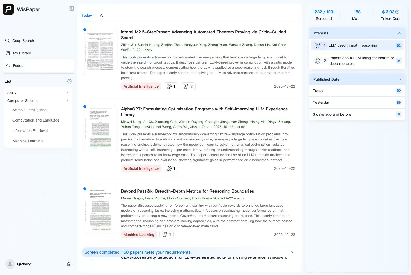 每天都有海量新论文发布,如何不错过你关心的前沿成果? WisPaper 的 AI 订阅源(Feeds) 来帮你解决。它会自动聚合并智能筛选 ArXiv、PubMed 等主流学术平台的最新论文,让你轻松掌握研究动态。