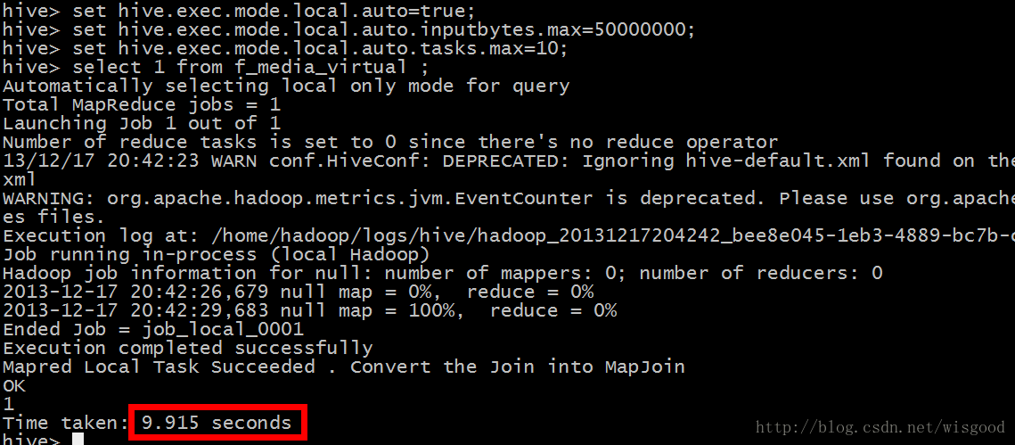 hive> set hive.exec.mode.local.auto=true;(默认为false)
