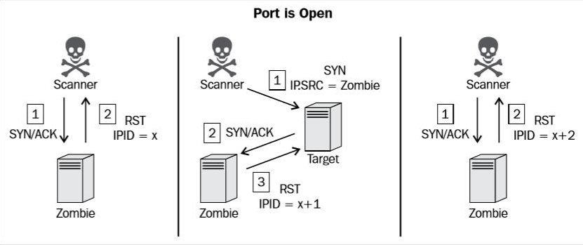 为了执行僵尸扫描,初始的 SYN+SCK 请求应该发给僵尸系统来判断返回 RST 封包中的当前 IPID 值。之后,将伪造的 SYN 封包发往目标咪表,带有僵尸主机的源 IP 地址。如果端口开放,扫描目标会将 SYN+ACK 响应发回僵尸主机。由于将是主机并没有实际发送之前的 SYN 请求,它会将 SYN+ACK 响应看做来路不明,并将 RST 请求发送回目标主机,因此 IPID 会增加 1。最后,应该向僵尸主机发送另一个 SYN+ACK 封包,这会返回 RST 封包并再次增加 IPID。增加 2 的 IPID 表示所有这些事件都发生了,目标端口是开放的。反之,如果扫描目标的端口是关闭的,会发生一系列不同的事件,这会导致 RST 响应的 IPID 仅仅增加 1。