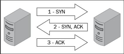 这一章中,会提及几个不同的 TCP 扫描方式。这些技巧包含隐秘扫描、连接扫描和僵尸扫描。为了理解这些扫描技巧的原理,理解 TCP 如何建立以及维护连接十分重要。TCP 是面向连接的协议,只有连接在两个系统之间建立之后,数据才可以通过 TCP 传输。这个和建立 TCP 连接的过程通常使用三次握手指代。这个内容暗指连接过程涉及的三个步骤。下图展示了这个过程: