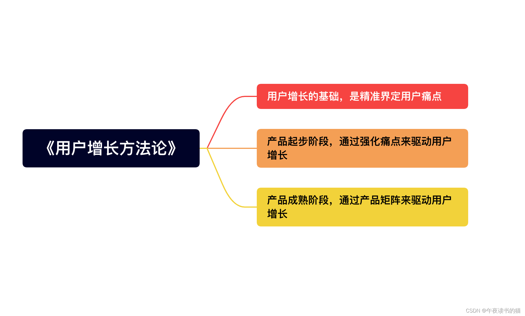《用户增长方法论》从产品、渠道、营销创意等多个维度,搭建了一套完整的用户增长方法体系 用户增长的基础,是精准界定用户痛点。界定痛点有三个维度,分别是用户、场景、问题。用户不同,场景不同,遇到的问题不同,解决方案也不一样
