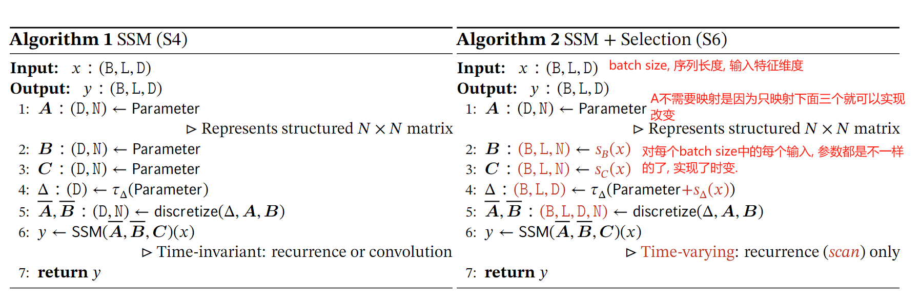 拿 B B B来说, 如果输入的维度是 [ L , D ] [L, D] [L,D], 即序列长度为 L L L, 每个token的维数是 D D D, 系统状态维数为 N N N. 原本的LTI系统参数是时不变的, 因此 B B B的维度就是 [ D , N ] [D, N] [D,N]. 现在作者加一个维度, 序列长度, 因此参数就是时变的了. 下面的伪代码写的很清楚: