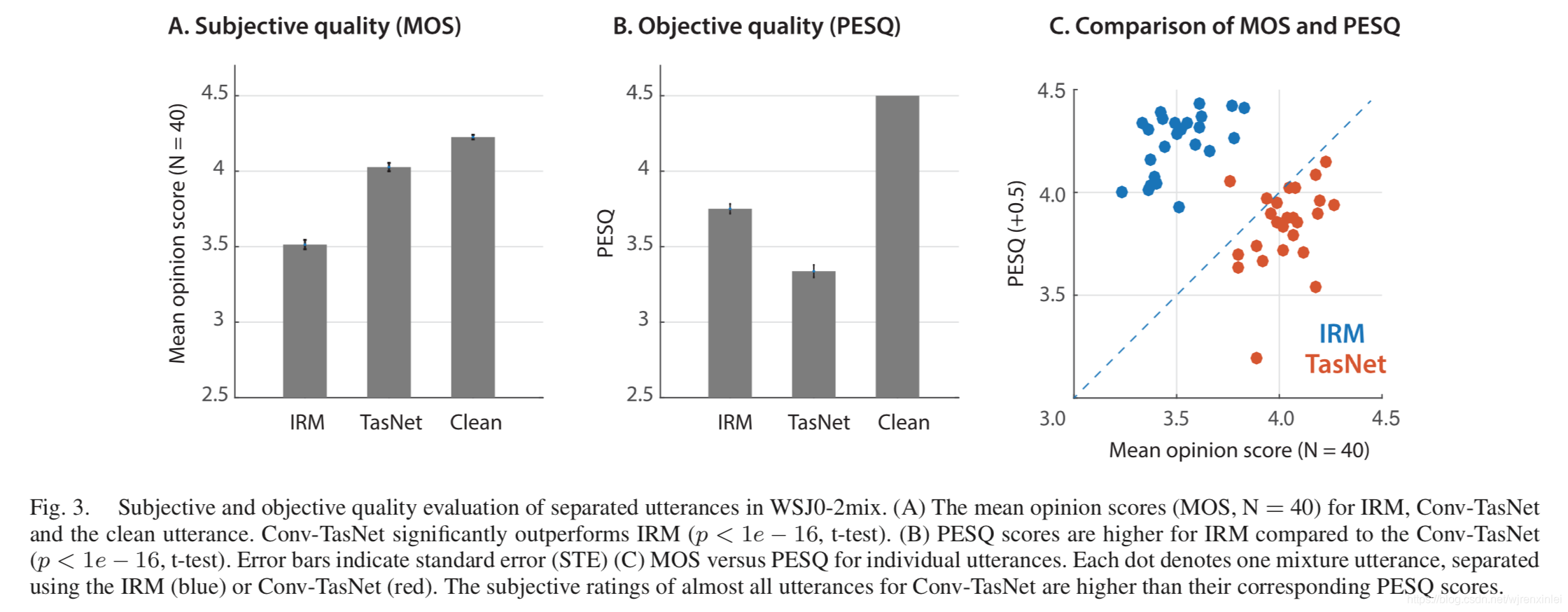 图3 和表VII 给出了人类主观质量测试的结果,其中 Conv-TasNet 的 MOS 显著高于 IRM 的 MOS( p < 1 e − 16 p <1e-16 p<1e−16,t-test)。 此外,在 25 种测试语音中,Conv-TasNet 在主观质量方面的评估基本均优于 IRM,如图3(c) 所示。 该观察结果表明,Conv-TasNet 分离出的语音的 PESQ 分数始终低于 MOS 分数,这可能是由于 PESQ 依赖于语音的幅度谱,这可能导致时域方法计算出的 PESQ 分数偏低。