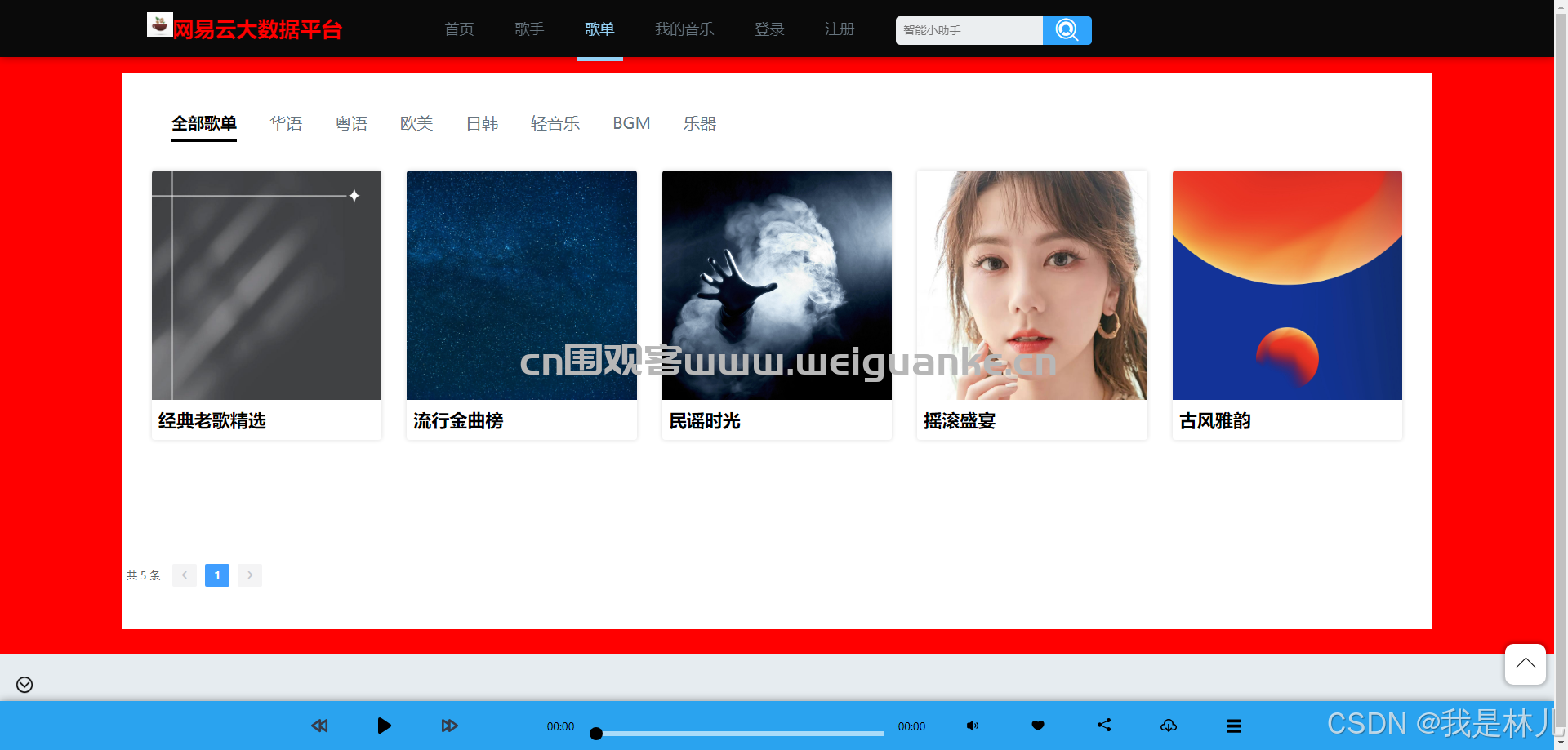 4. 歌单:展示歌单信息,包括歌单介绍、歌曲列表等。