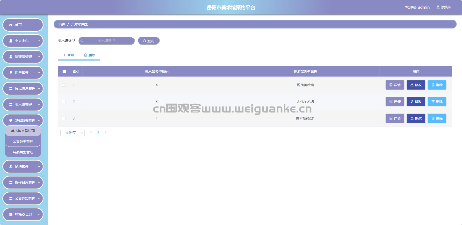 美术馆类型管理:添加/编辑/删除美术馆分类信息。