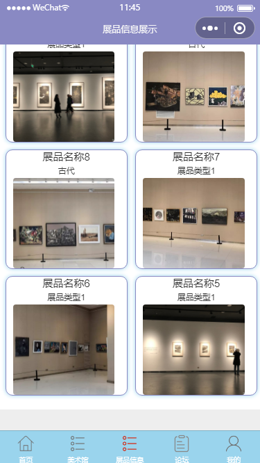 首页:浏览首页展示内容,包括轮播图广告、推荐展品/美术馆、热门论坛话题等。