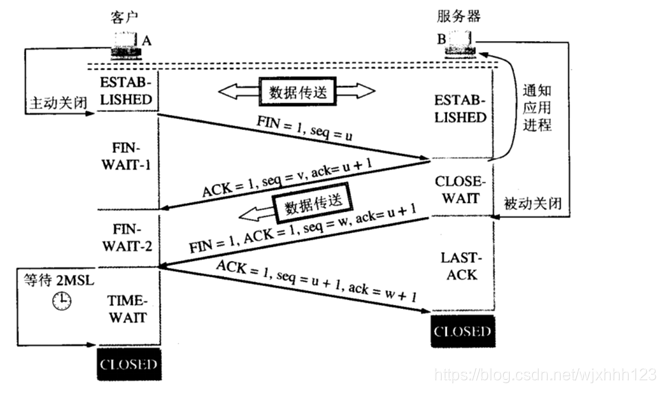 第四次: A---->B ACK=1,seq=u+1,ack=w+1
