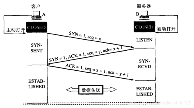 第一次:A(SYN-SENT) ----> B(LISTEN) SYN=1,seq=x,