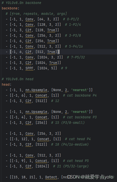以C2f[128,true]为例,128是输出feature map的通道数,True代表Bottleneck模块中shortcut=True, 没有写表示False。from: 输入,-1表示上层的输出作为本层的输入, [15, 18, 21] 为索引值,表示detect层的输入为第15层、18层、21层的输出。以nn.upsample为例, None表示不指定输出尺寸, 2表示输出尺寸为输入尺寸的2倍,“nearest”表示上采样差值方式为最近邻差值。repeats: 模块的重复次数。