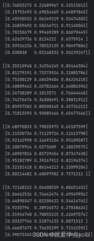 以输出的形式举一个8x8x3feature map的例子,如代码块2所示。