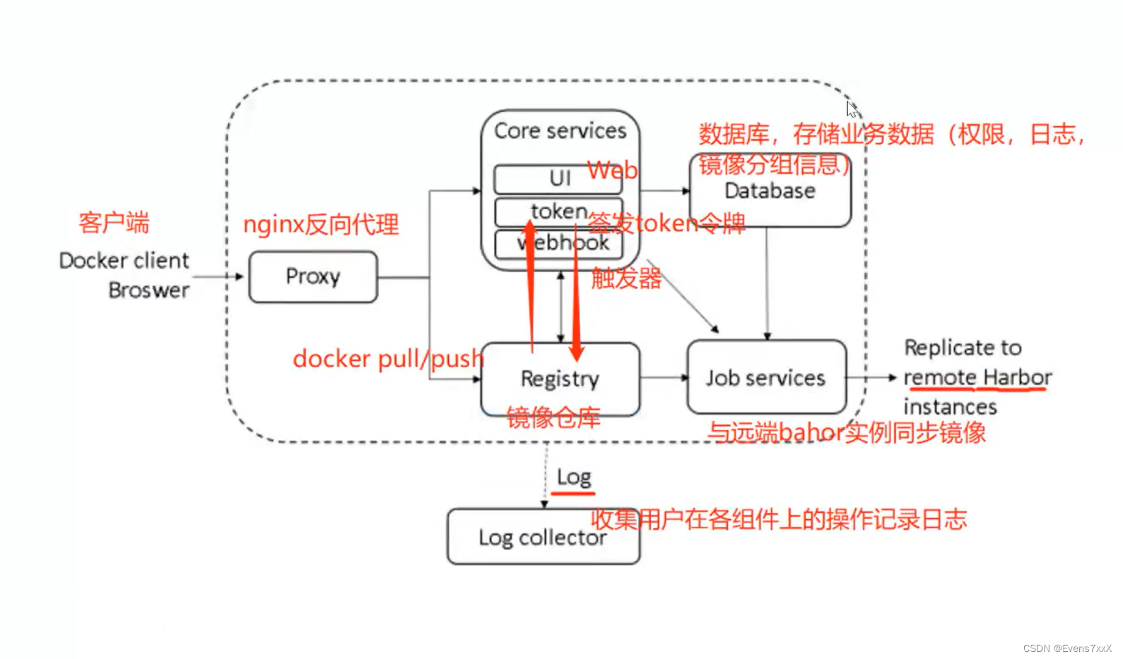 1.Proxy:是一个 nginx 的前端代理,Harbor 的 Registry、UI、Token 服务等组件,都处在 nginx 反向代理后边。 该代理将来自浏览器、docker clients 的请求转发到后端不同的服务上。