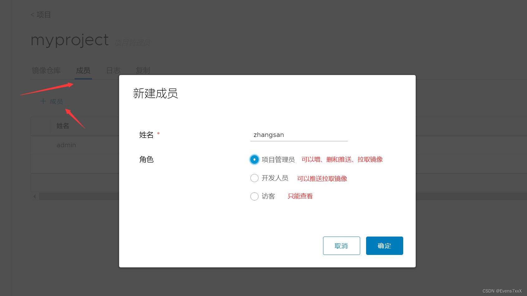 | 项目管理员 | 除了读写权限,同时拥有用户管理/镜像扫描等管理权限 |