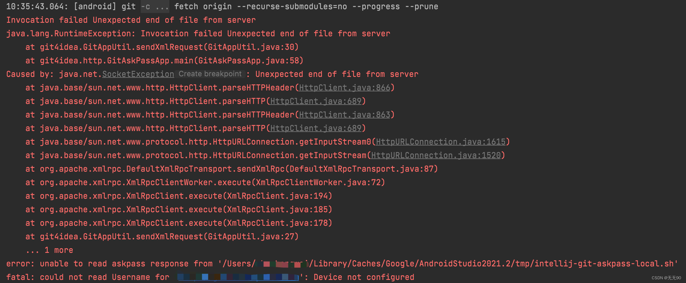 但Android studio中并没有弹出用户名、密码输入框,而是直接报错了。