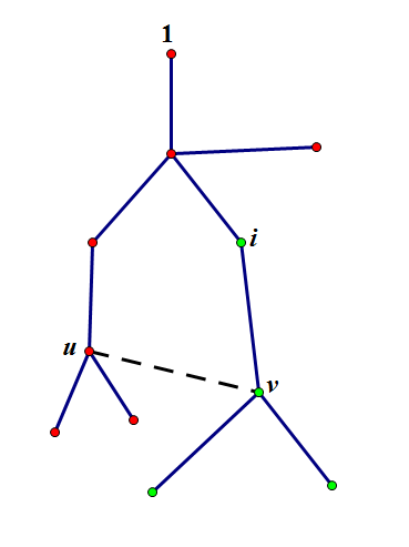 其中1是根。我们将树记作T,i的子树记作B。图中,B是绿色点,T-B是红色点。