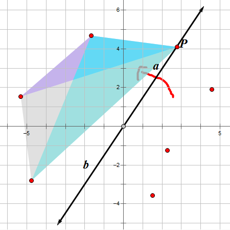 然后关键在于:每当射线a扫到一个点P时,我们统计P和直线l“左侧”所有点形成的三角形(严格地讲,是和a叉积为正的半平面):