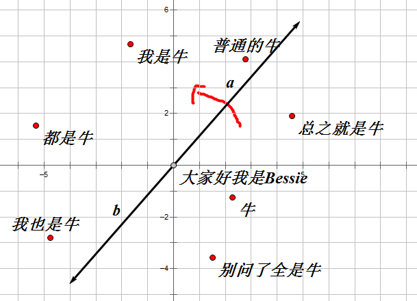 直线l分成两条射线,一个是a,另一个是b。它绕着原点(Bessie所在点)旋转,请自行想象在孙悟空手中旋转的金箍棒。